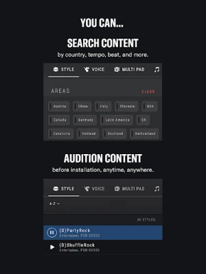 Content can be auditioned in the app before installation. You can listen to the auditions anytime, even without being connected to your instrument.