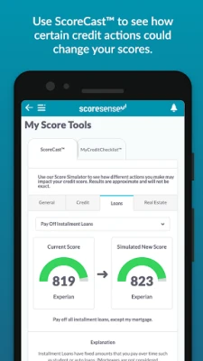 • Simulate score changes. See how certain credit actions you take could change your scores with ScoreCast™.